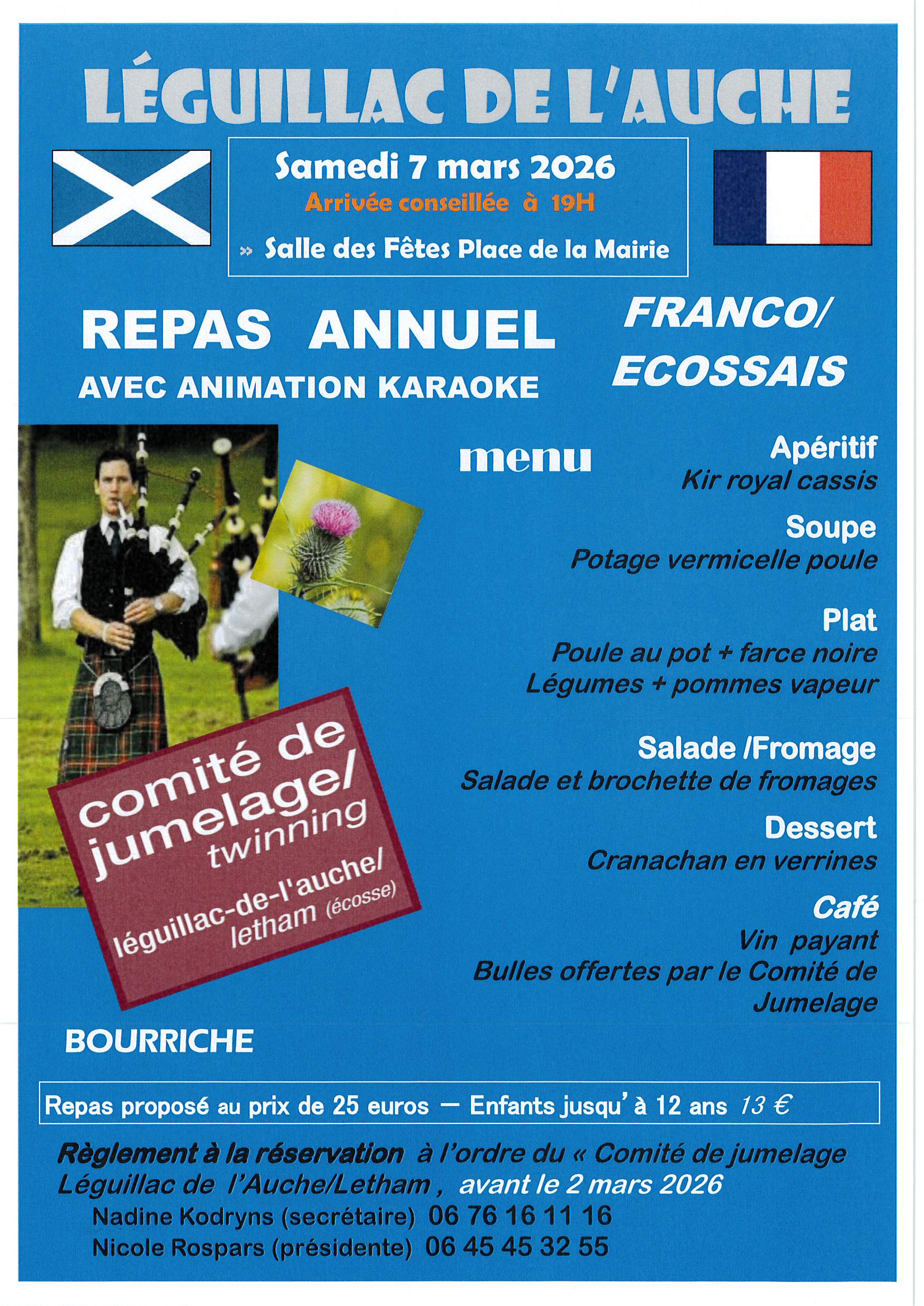 Samedi 7 mars, un repas écossais vous sera proposé par le comité de jumelage. Inscription avant le 2 mars 2026