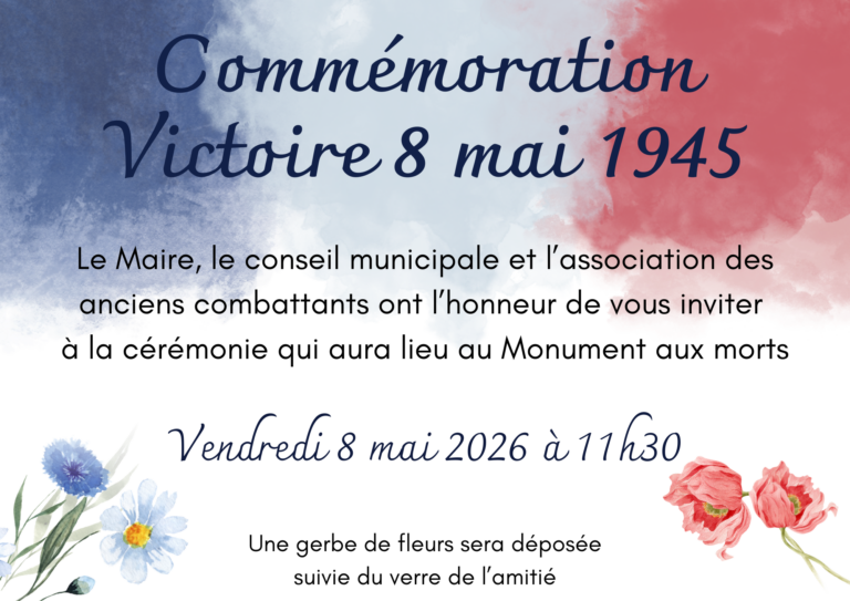 La Municipalité a l’honneur d’inviter l’ensemble des habitants à participer à la cérémonie de commémoration du 8 mai 1945, marquant la fin de la Seconde Guerre mondiale en Europe et la victoire des forces alliées.