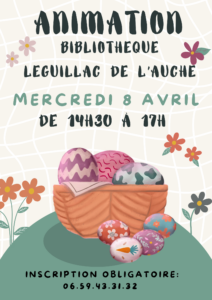 Audrey vous propose, mercredi 8 avril, des activités sur le thème de Pâques à la bibliothèque. Inscription au 06.59.43.31.32