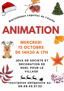 Audrey, vous propose un atelier jeux de société et décoration de Noel pour le village à la bibliothèque municipale. Pensez à réserver au 06.59.43.31.32