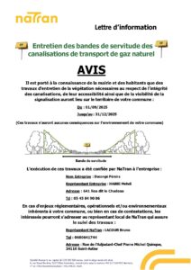 Travaux d’entretien de la végétation nécessaire au respect des canalisations du gaz naturel du 01/09/2025 au 31/12/2025.