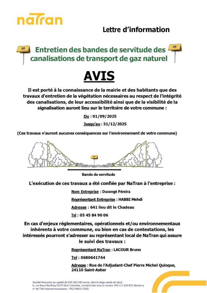 Travaux d’entretien de la végétation nécessaire au respect des canalisations du gaz naturel du 01/09/2025 au 31/12/2025.