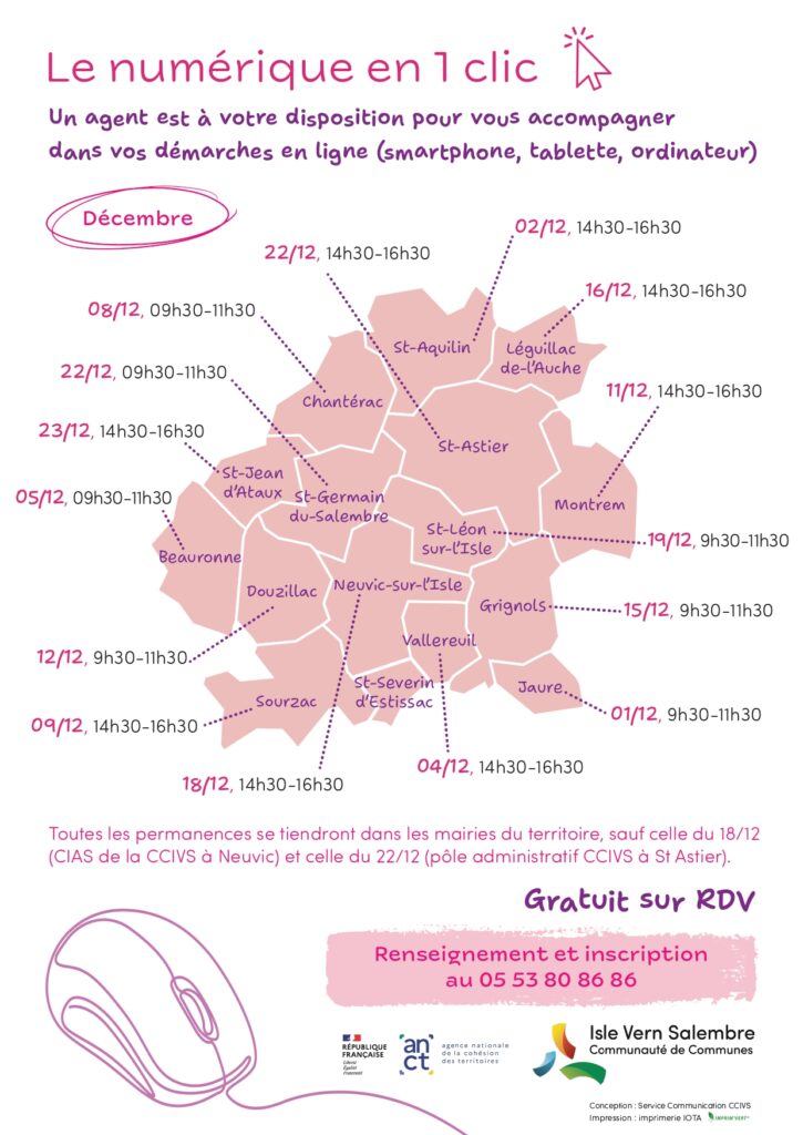 Si vous souhaitez vous faire aider dans vos démarches numériques, un agent sera présent gratuitement à la mairie le mardi 16 décembre de 14h30 à 16h30. Penser a réserver au 05.53.80.86.86 La CCIVS, en partenariat avec la Préfecture de la Dordogne et l’ANCT (Agence Nationale de la Cohésion des Territoires), propose des permanences numériques sur le territoire. […]