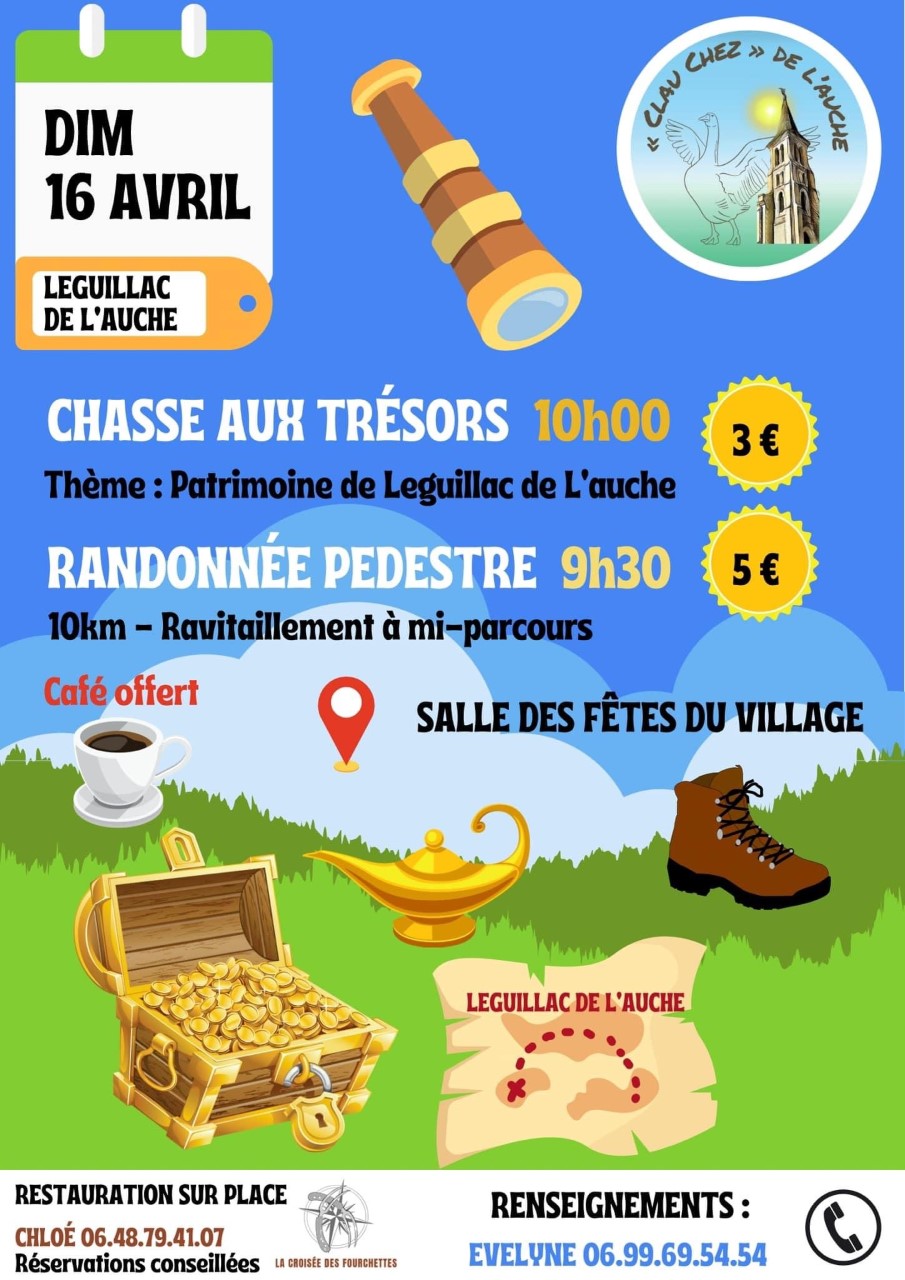 L’association « Clau chez » de l’Auche organise pour la première fois une chasse aux trésors sur le Patrimoine de Léguillac de l’auche. Petits et grands sont conviés à 10h pour s’amuser tout