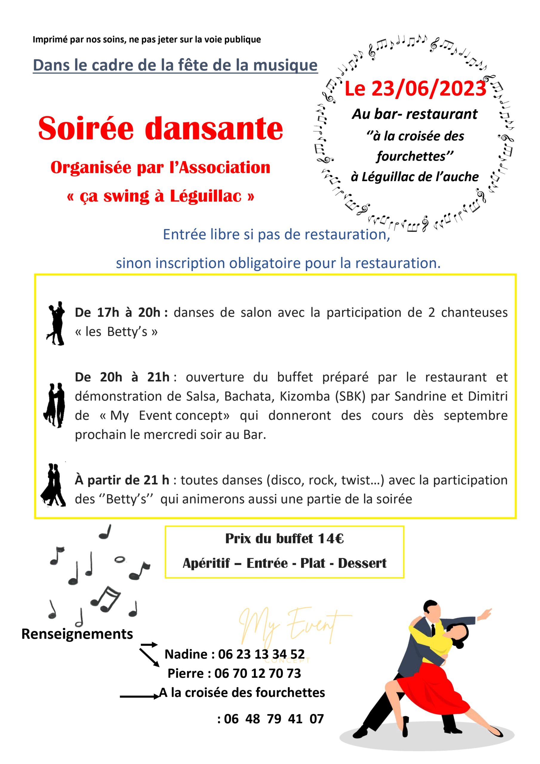 Dans le cadre de la fête de la musique, l’association »ça swing à Léguillac » vous convie à l’animation musicale et dansante organisée pour la soirée du vendredi 23 Juin 2023.